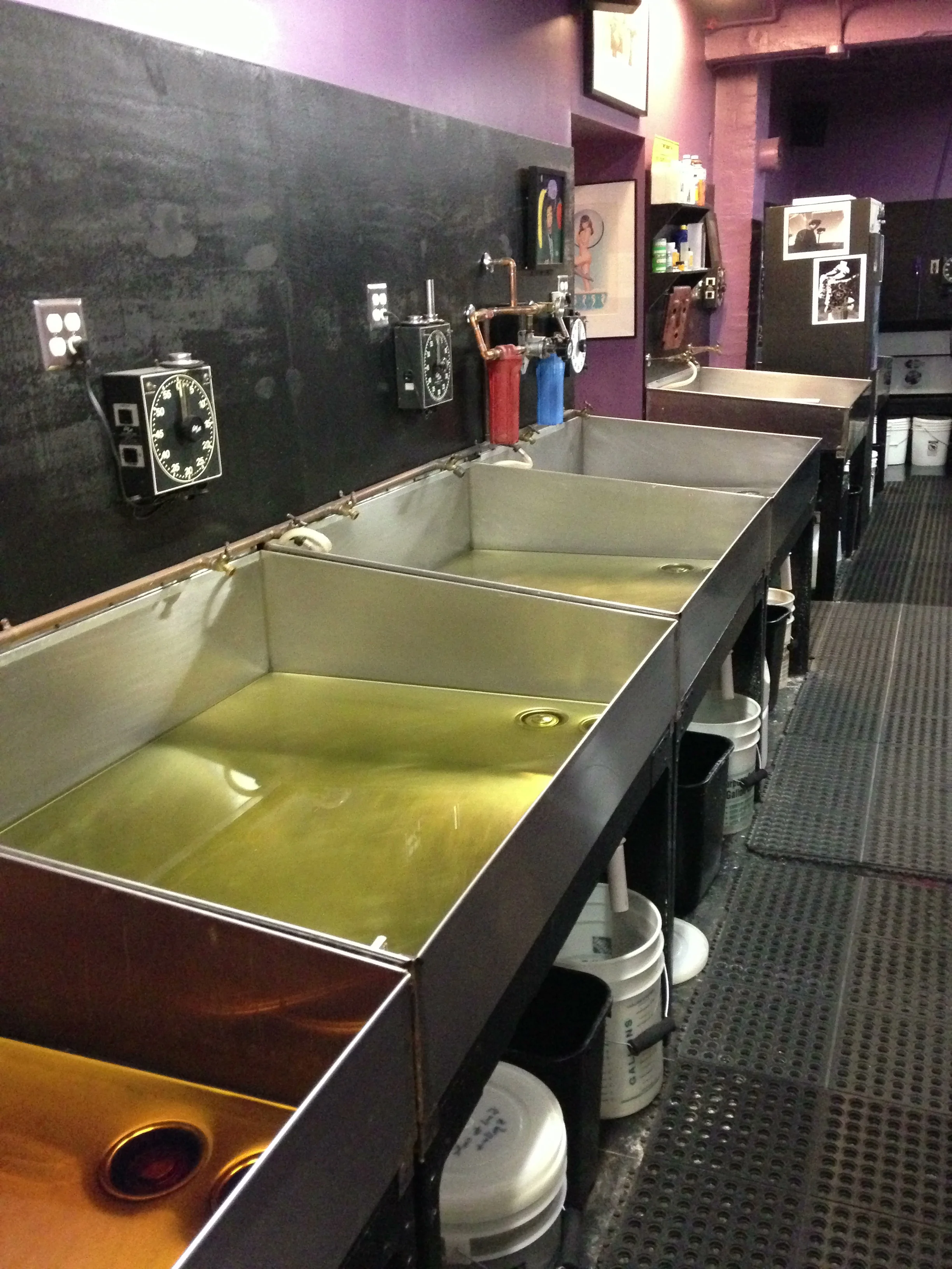 Six 40x50 inch stainless steel sinks with under sink chemical capture, fingertip temperature controlled water supply, gra lab timers at each sink station, Zone VI Compensation Developer Timer.
